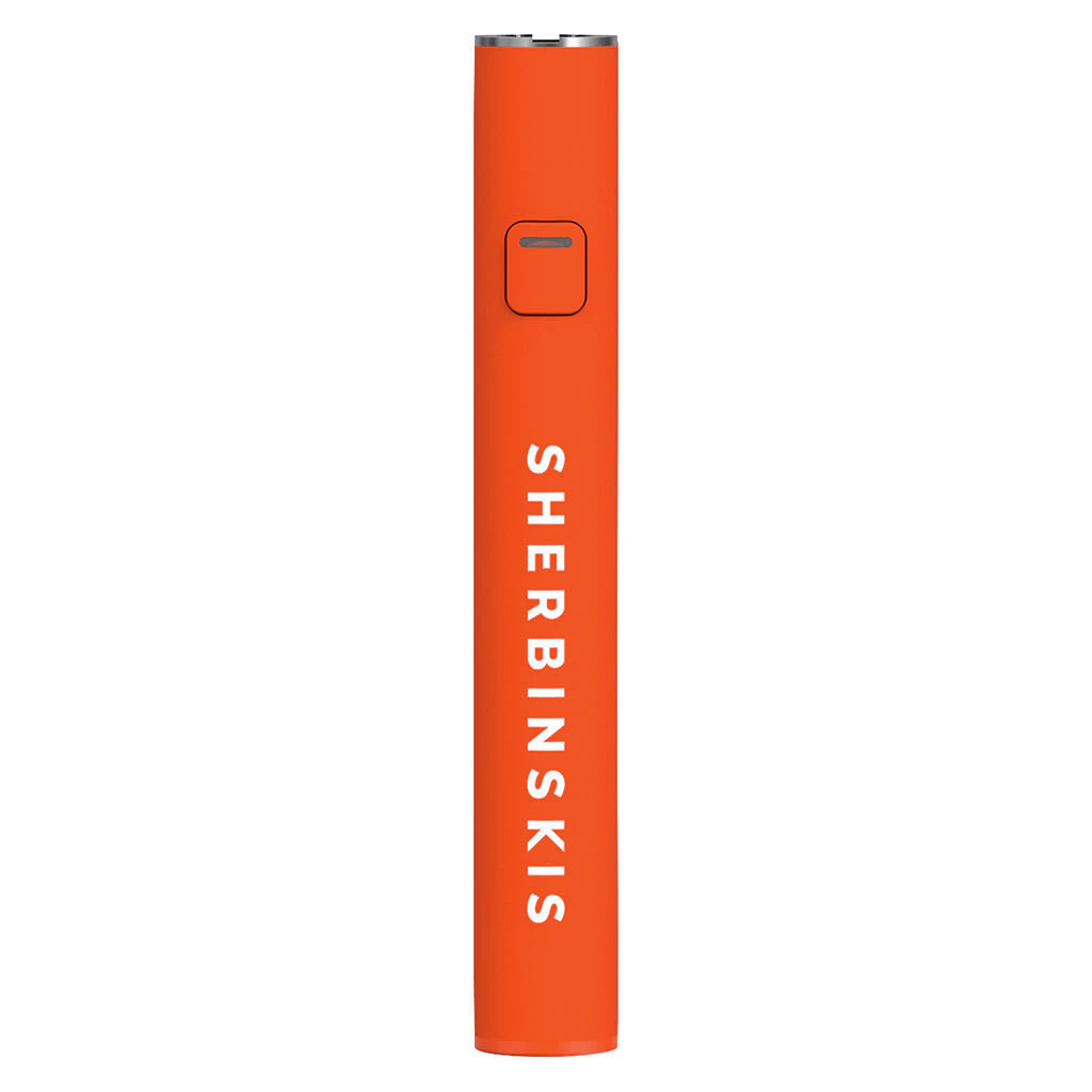 A premium soft-touch 510 battery in Sherbinskis' trademark Orange hue, the perfect compliment to Sherbinskis' cartridges. This auto-draw, USB-C rechargeable vape battery has a pre-heat function and multiple voltage settings which allow for ideal performance with either true live resin or distillate based formulations. Click the button 3 times to cycle through voltage settings.
